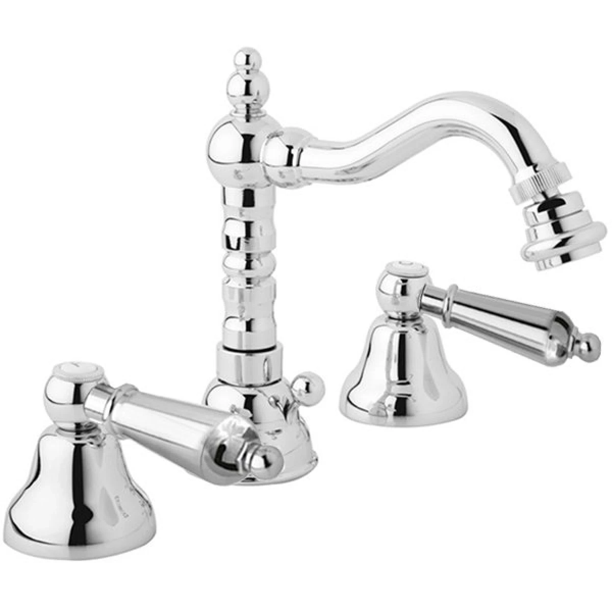 Двухвентильный смеситель с фиксированным изливом и аэратором, монтируемый в три отверстия. Имеет долгий срок эксплуатации за счет качественных деталей, неприхотлив в уходе. Станет прекрасным дополнением ванной комнаты в классическом или ретро стиле.