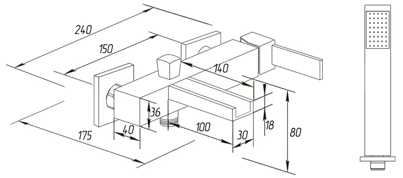 - Душевой гарнитур: ручной душ, металлический шланг, настенный держатель.