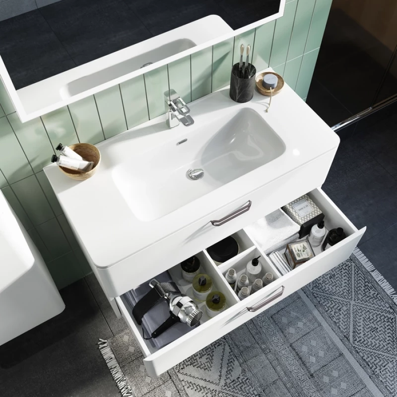 Подвесная тумба с раковиной Iddis Brick 100 BRI10W1i95К с двумя выдвижными ящиками с направляющими скрытого монтажа и механизмом плавного доведения. Предназначена для использования в ванных комнатах с повышенной влажностью. Плоская керамическая раковина повторяет закругленную форму тумбы. Надежная фурнитура рассчитана на 30 тысяч открываний. Направляющие выдерживают вес доверху наполненного ящика.
