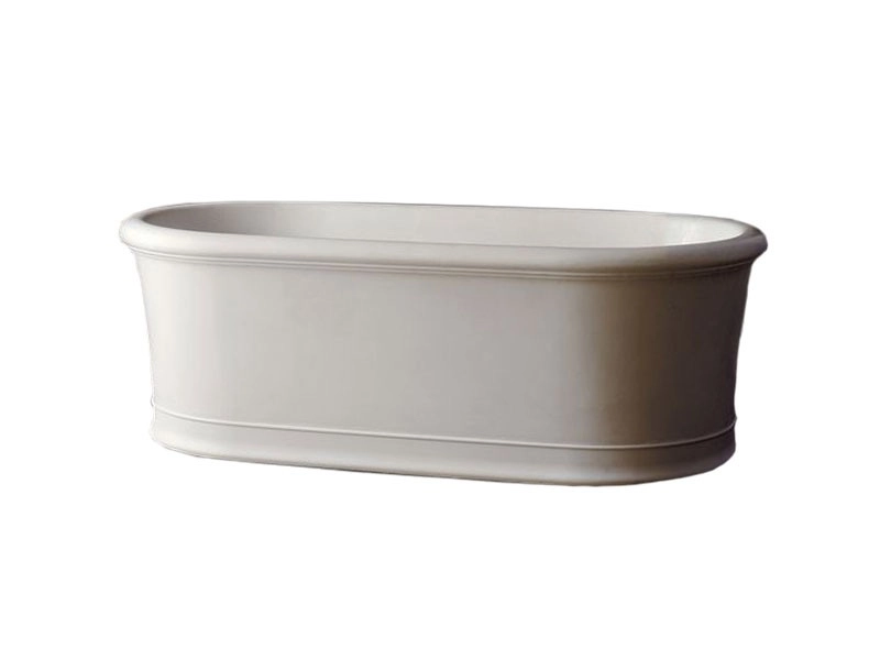 Отдельно стоящая овальная ванна без отверстий под смеситель со встроенной сливной колонной. Ванна выполнена из композитного материала на основе кварца.